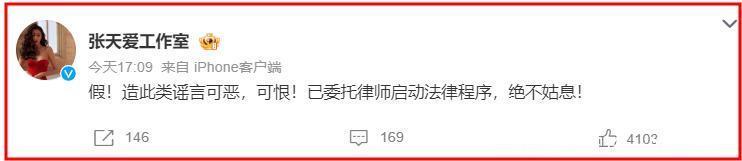 她在社交账号写道:假!造此类谣言可恶,可恨!已委托律师启动法律程序,绝不姑息!